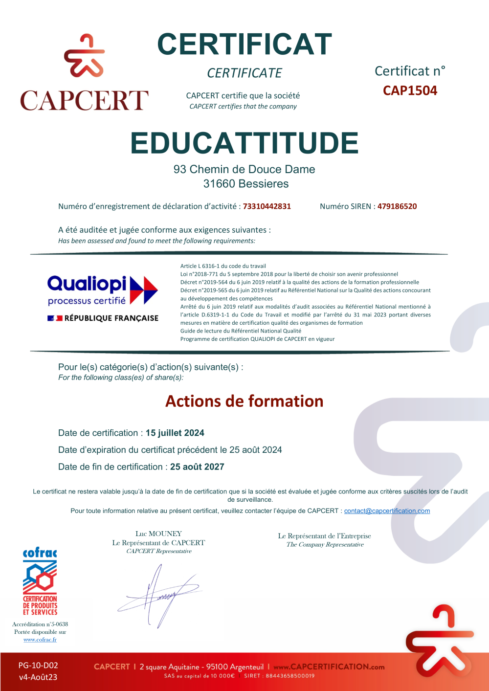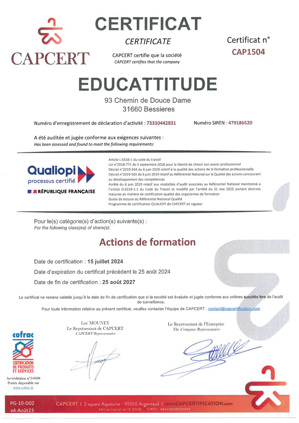 La certification Qualité a été délivrée au titre de la catégorie d’actions suivantes: « actions de formation ».